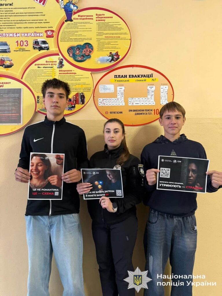 На Уманщині інспектори служби освітньої безпеки провели профілактичні зустрічі з учнями, присвячені темі протидії торгівлі людьми. Захід мав на меті не лише поінформувати дітей, а й навчити їх розпізнавати потенційні загрози у повсякденному житті. Інформацію взято з офіційної сторінки у фейсбук Уманського районного управління поліції.