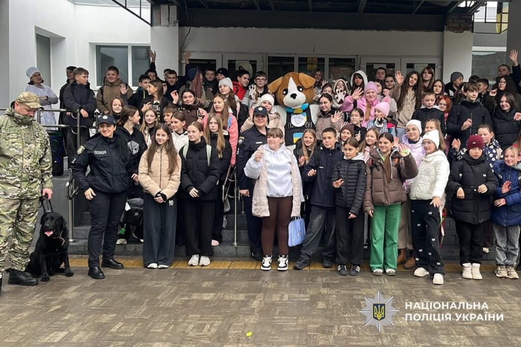 Практична частина заняття стала справжнім видовищем: кінологи продемонстрували роботу службового собаки, який злагоджено та швидко знаходив імітовані вибухові предмети. Діти мали можливість побачити, як саме спеціально натреновані чотирилапі помічники поліції працюють у реальних умовах.