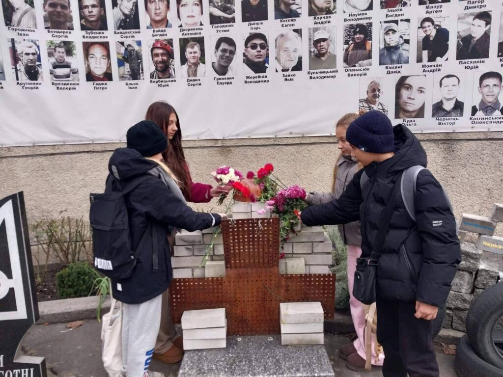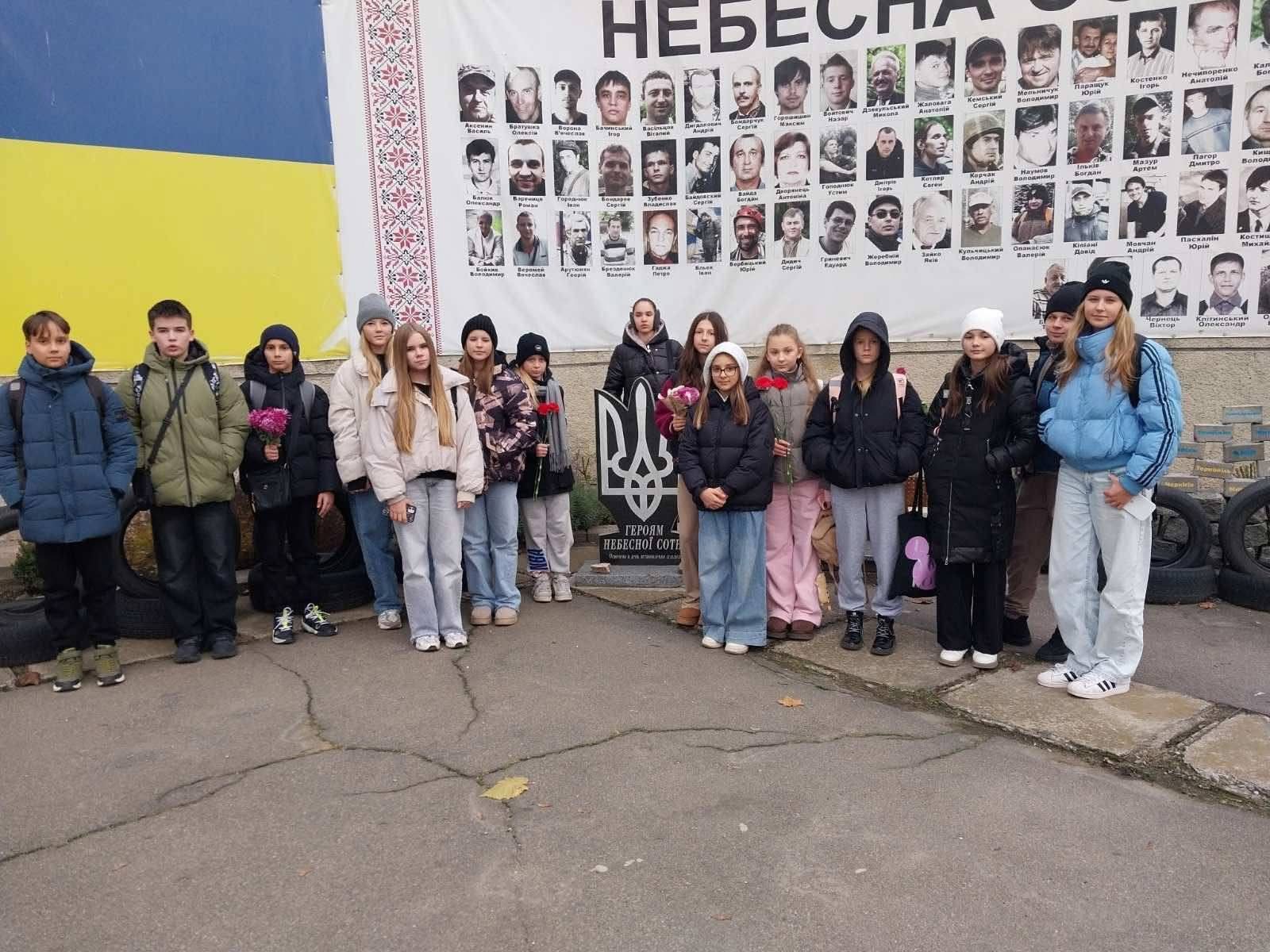 Після заняття семикласники відвідали пам’ятний знак Героям Небесної Сотні. Діти поклали квіти та свічки, вшанували загиблих хвилиною мовчання та висловили щиру вдячність тим, хто віддав своє життя за свободу України.