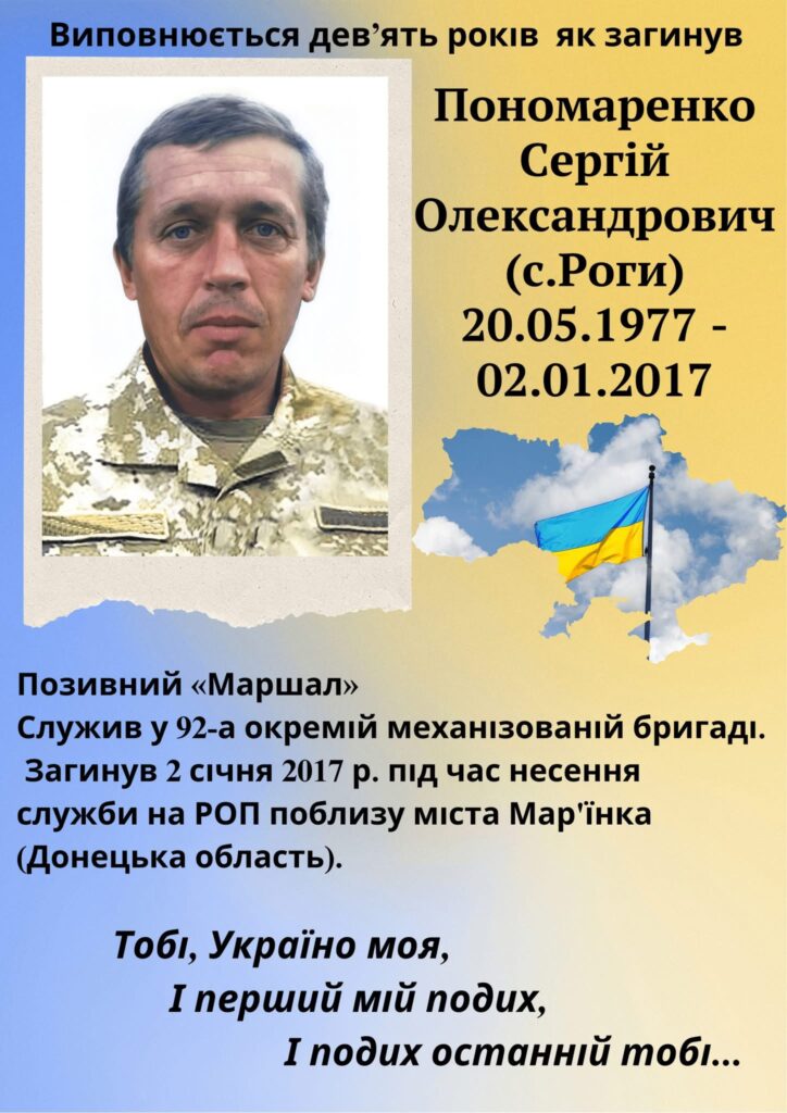 Сергій Пономаренко став на захист рідної землі у найважчий для країни час. Він боровся не лише за територіальну цілісність держави, а й за право кожного з нас жити у вільній, незалежній Україні. Його мужність, вірність присязі та жертовність — приклад справжнього героїзму.
